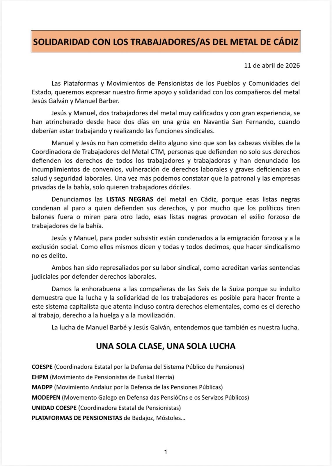 Lo último documentos/noticias/imágenes: 13-04-2026 Comunicado: AUDITORÍA de la cuentas de la S/S YA. 11-04-2026 Solidaridad con los Trabajadores/as del Metal de Cádiz (Unidad de Acción) 21-03-2026 No a las guerras y a sus consecuencias 09-03-2026 Requisas y Pensiones (Eduardo Luque) 09-02-2026 NO A LA GUERRA, LOS PUEBLOS NO LAS PROVOCAN 04-02-2026 Comunicado 8 de marzo (Comisión Mujer) 26-02-2026 Manifiesto caída Escudo Social (PAH-Sind.Inquil.-COESPE) 21-02-2026 Comunicado UnidAd Acción sobre Pensiones Públicas y Derechos_Personas Vulnerables 20-02-2026 Solidaridad con el Pueblo Cubano 10-06-2025 Fichas sobre lo dañino que es para el SPP los mal llamados Planes de Pensiones de Empleo