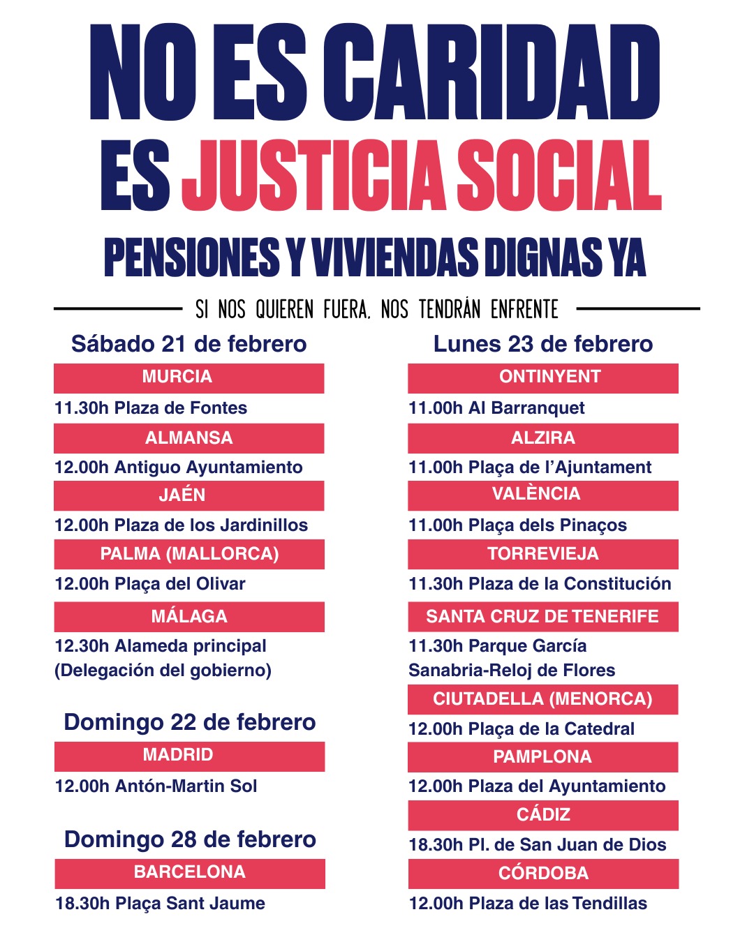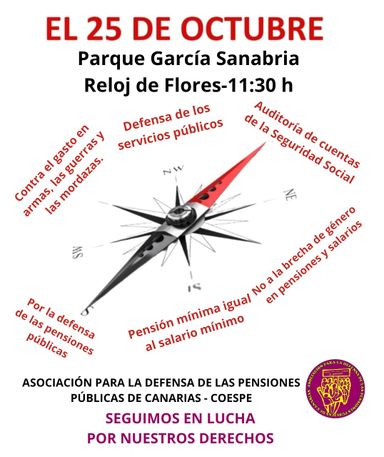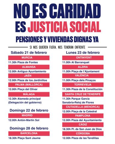 Exigimos pensiones públicas dignas, retornar, de entrada, a la jubilación a los 65 años y reclamar la jubilación ordinaria a los 60 años, garantizar la revalorización de las pensiones como mínimo con el IPC real, recuperar la paga compensatoria en enero en función de ese mismo IPC, así como la derogación de todos aquellos aspectos o puntos negativos en todas las reformas de pensiones habidas desde 2011, las cuales han producido pensiones iniciales muy inferiores a las que se tenían derecho anteriormente. También la derogación de las reformas laborales que precarizan el trabajo rebajando salarios y cotizaciones sociales. Sin salarios dignos no habrá pensiones dignas.
