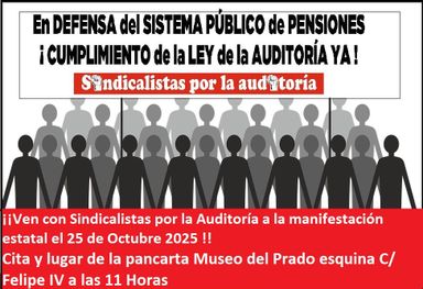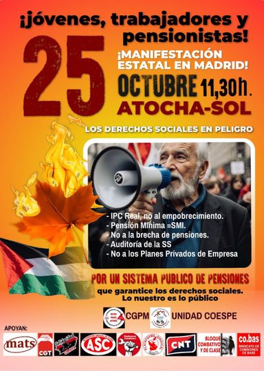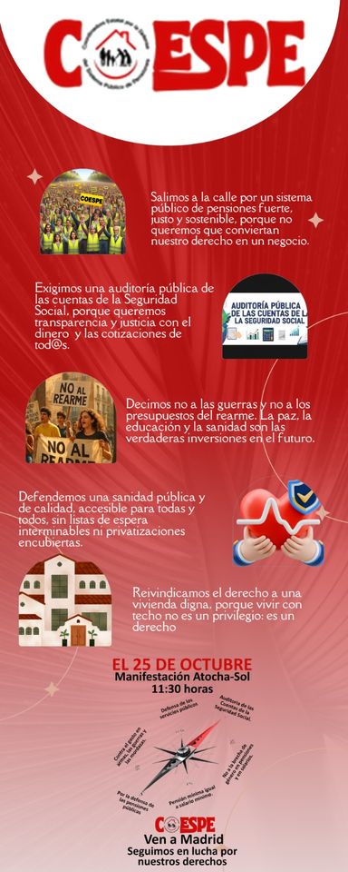 Lo último documentos/noticias/imágenes: 27-10-2025 Sobre el 25 Octubre 23-10-2025 Comunicado agradecimiento colaboraciones 25 octubre 21-10-2025 Nota de Prensa sobre el 25-octubre 20-10-2025 Comunicado Unidad Acción Estatal Manifestación 25 octubre en Madrid 20-20-2025 Apoyo al 25-octubre de Plataformas por la Paz y contra el Rearme 20-10-2025 (FSM) 25_octubre. Jornada de Movilización Pensionista en España 20-10-2025 ¡A Madrid, el 25 de octubre! 17-10-2025 No más violencia policial 15-10-25 Pensiones Públicas: La realidad que no quieren contarte 13-10-2025 Apoyo a la Huelga General 15 de Octubre por Palestina 27-08-2025 Motivos para llenar Madrid el 25 de Octubre 10-06-2025 Fichas sobre lo dañino que es para el SPP los mal llamados Planes de Pensiones de Empleo