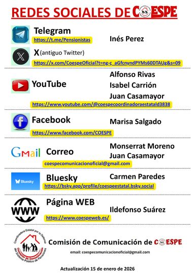 Lo último documentos/noticias/imágenes: 26-02-2026 Manifiesto caída Escudo Social (PAH-Sind.Inquil.-COESPE) 21-02-2026 Comunicado UnidAd Acción sobre Pensiones Públicas y Derechos_Personas Vulnerables 20-02-2026 Solidaridad con el Pueblo Cubano 19-02-2026 Comunicado U.Acción: Llamamiento a accciones 21,22 y 23 febrero 17-02-2026 No es caridad, es justicia social. Manifiesto COESPE-Sindicato de Inquilinos 10-02-2026 65ymas.es: El incremento del IPC medio, no garantiza el poder adquisitivo de las pensiones 01-02-2026 Por la defensa de un escudo social básico 30-01-2026 Comunicado UA derogación subida pensiones 2026 27-01-2026 Coespe: Mejora escudo social 23-01-2026 Carta a Fernando Grande-Marlasca 10-06-2025 Fichas sobre lo dañino que es para el SPP los mal llamados Planes de Pensiones de Empleo